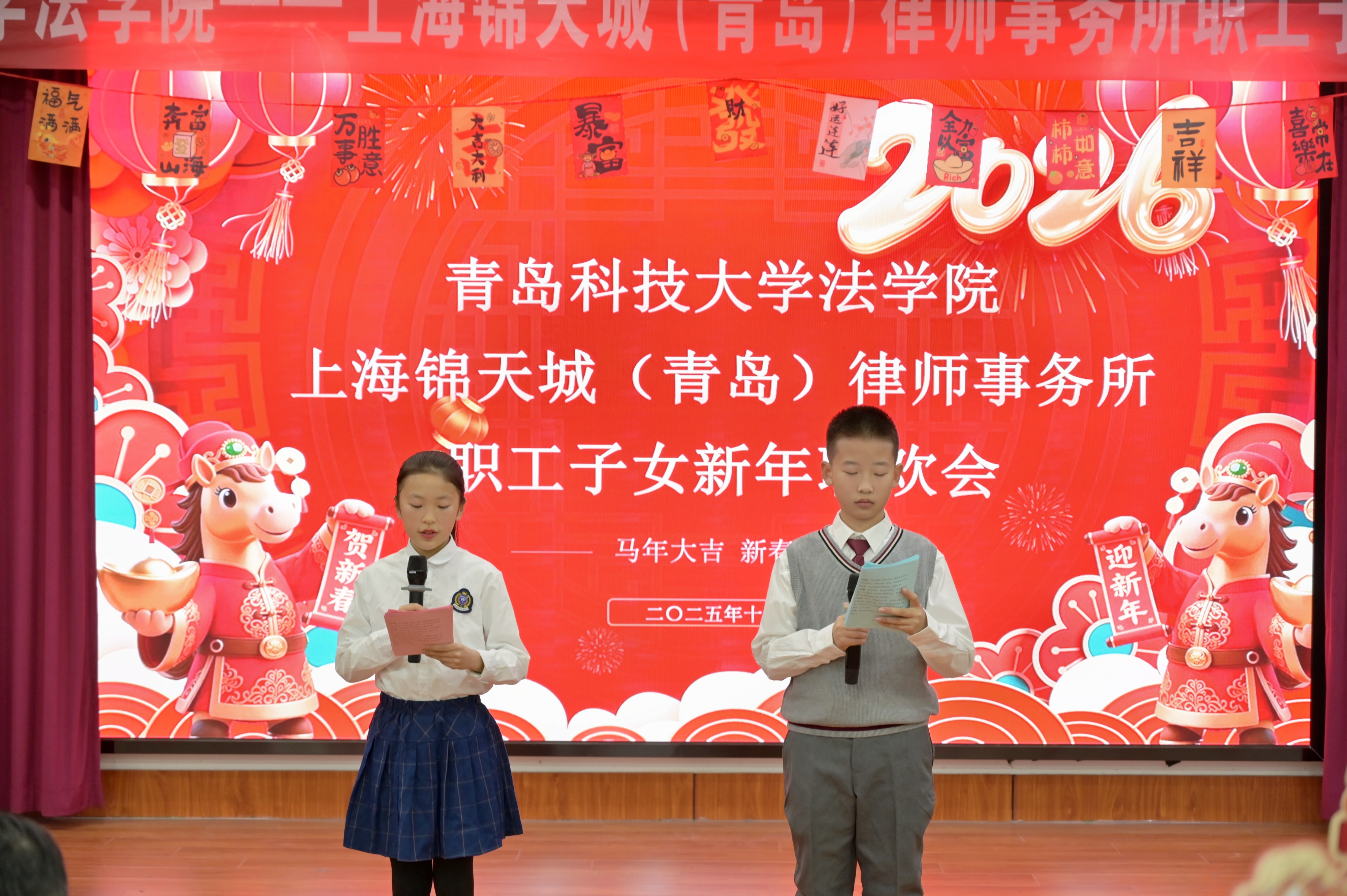 岁月更迭,华章日新。12月26日晚,法学院与上海锦天城(青岛)律师事务所欢聚一堂,联合举办“携手迎新年·共绘新未来”职工子女新年联欢会。双方职工、家属及子女共同参与,在欢声笑语中共迎2026年的到来。