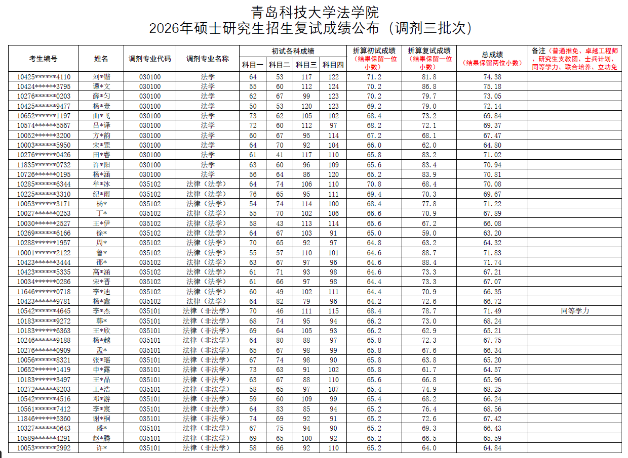 青岛科技大学法学院2026年硕士研究生招生调剂三批次复试成绩公布