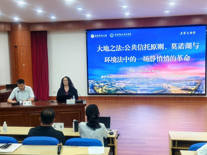 9月8日晚,法学院在弘毅楼A201模拟法庭举办“名家大讲堂”。本期讲堂的主题为“Law for the Land: The Public Trust Doctrine, Mono Lake, and a Quiet Revolution in Environmental Law”,佛罗里达州立大学法学院Erin Ryan教授受邀主讲。讲座由法学院院长助理、法律系主任辛帅主持并担任翻译,法学院青年教师代表李浩梅、秦楠担任与谈人,法学院研究生和本科生代表参加了本次讲座。
