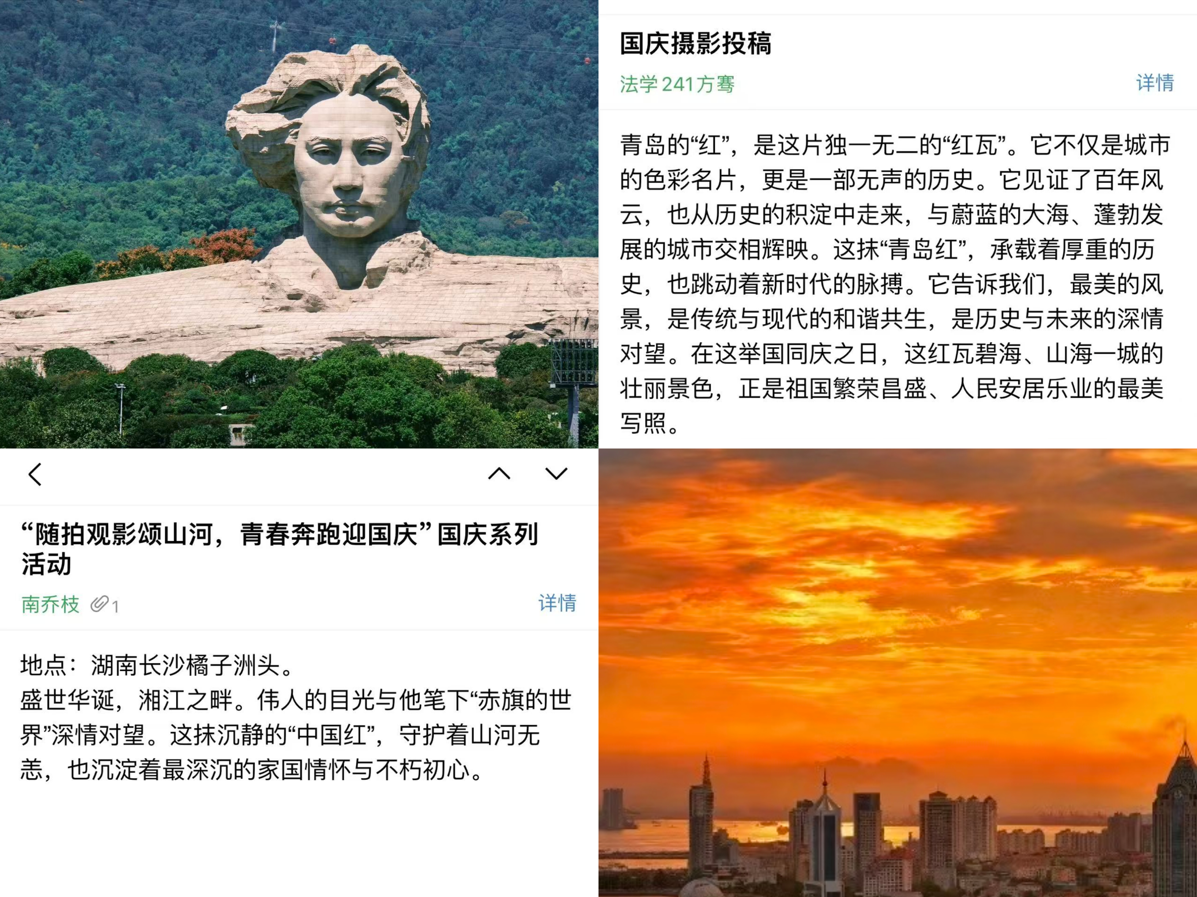 镜头定格中国红,光影传递家国情。中国红,是信仰的底色,更是时代的华章。法学院开展“盛世华诞,我眼中的中国红”随手拍活动,鼓励学子以镜头为眼、以画面为语,捕捉身边的红色印记。从迎风飘扬的五星红旗到街头巷尾的大红灯笼,从城市地标的红色建筑到平凡生活的温暖瞬间,同学们用照片和文字传递真挚的情感,在光影交织中感悟家国同脉,在创作表达中坚定文化自信。