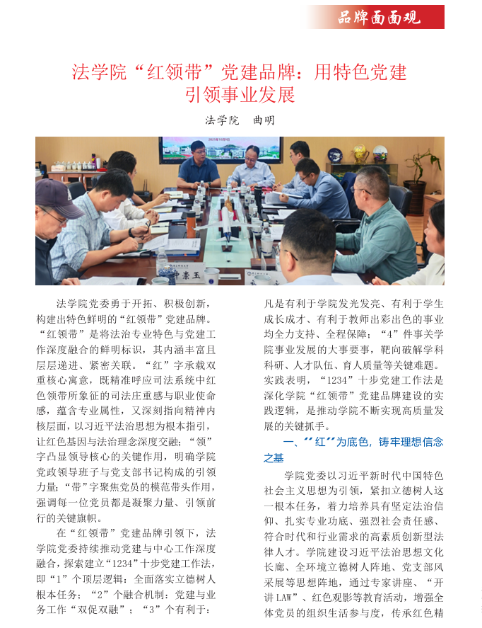 在“红领带”党建品牌引领下,法学院党委持续推动党建与中心工作深度融合,探索建立“1234”十步党建工作法, 即“1”个顶层逻辑:全面落实立德树人根本任务;“2”个融合机制:党建与业务工作“双促双融”;“3”个有利于:凡是有利于学院发光发亮、有利于学生成长成才、有利于教师出彩出色的事业均全力支持、全程保障;“4”件事关学院事业发展的大事要事,靶向破解学科科研、人才队伍、育人质量等关键难题。 实践表明,“1234”十步党建工作法是深化学院“红领带”党建品牌建设的实 践逻辑,是推动学院不断实现高质量发展的关键抓手。