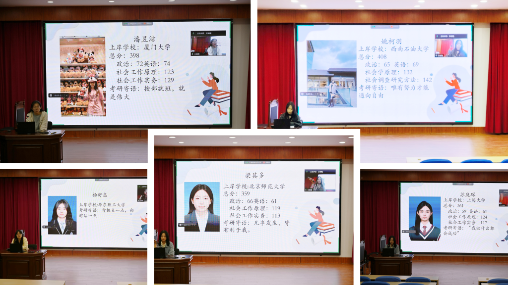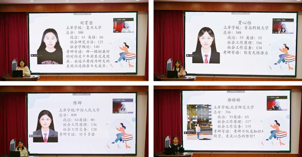 本次分享会由社会工作系教师王卫国、刘琰进行考研指导,并邀请多位考研成功的学生为同学们答疑解惑,提供备考经验。社会工作专业本科各年级同学积极参与,高密校区社会工作专业学生们也通过线上方式参与。